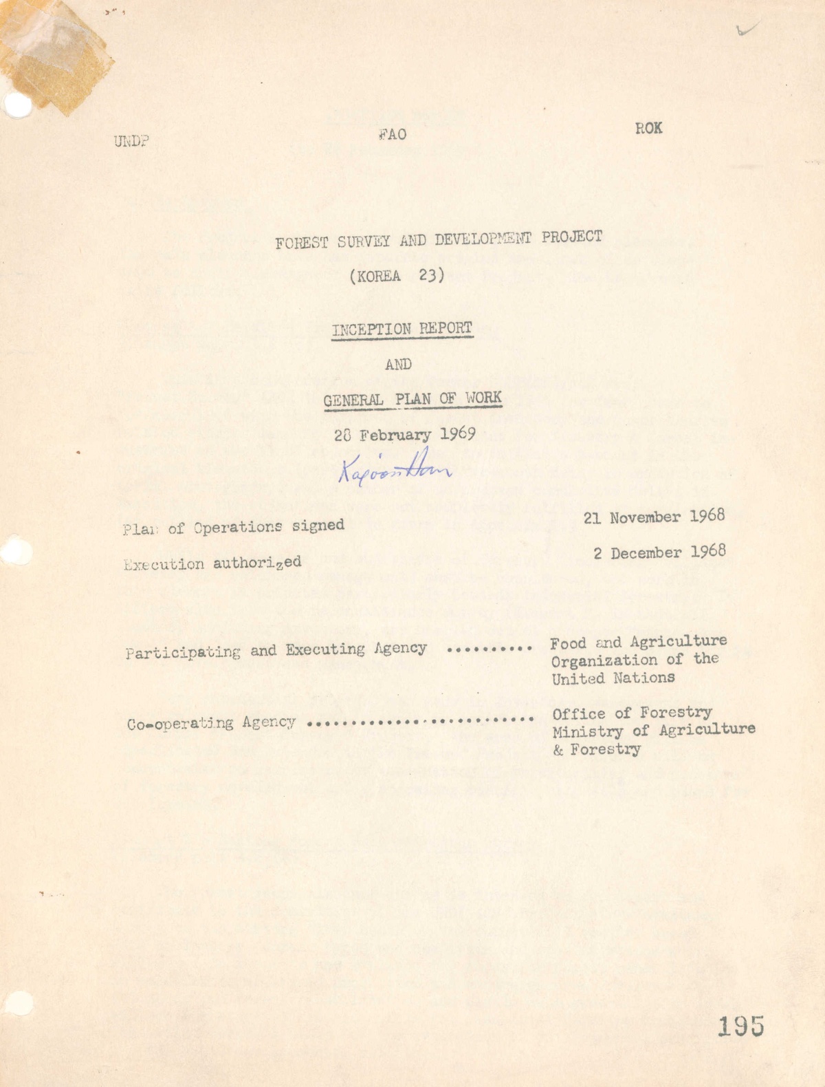 | 179 | 일반기록물 | FOREST SURVEY AND DEVELOPMENT PROJECT.(KOREA 23). INCEPTION REPORT AND GENERAL PLAN OF WORK. 28.FEBRUARY, 1969 | 농촌진흥청 | 1964 |
