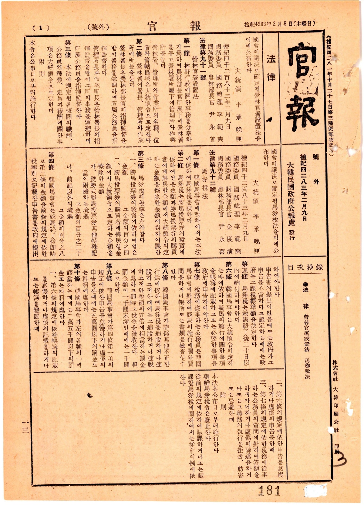 | 18 | 일반기록물 | 영림관서설치법(법률제91호) | 총무처 | 1950 |