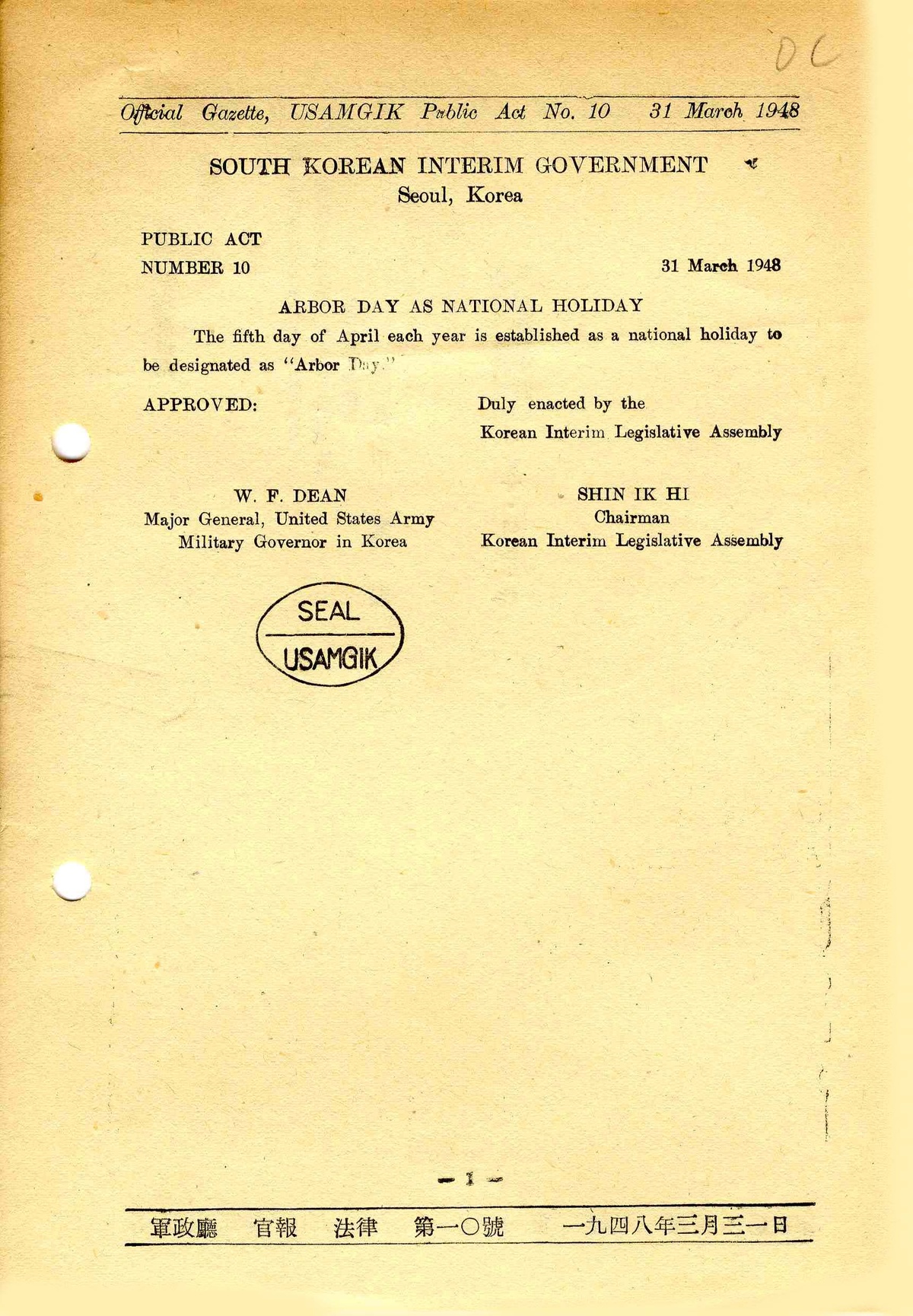| 14 | 유관기관기록물 | 법률 제10호 식목일 | 미군정청 | 1948 |