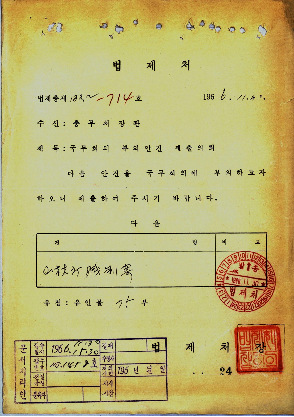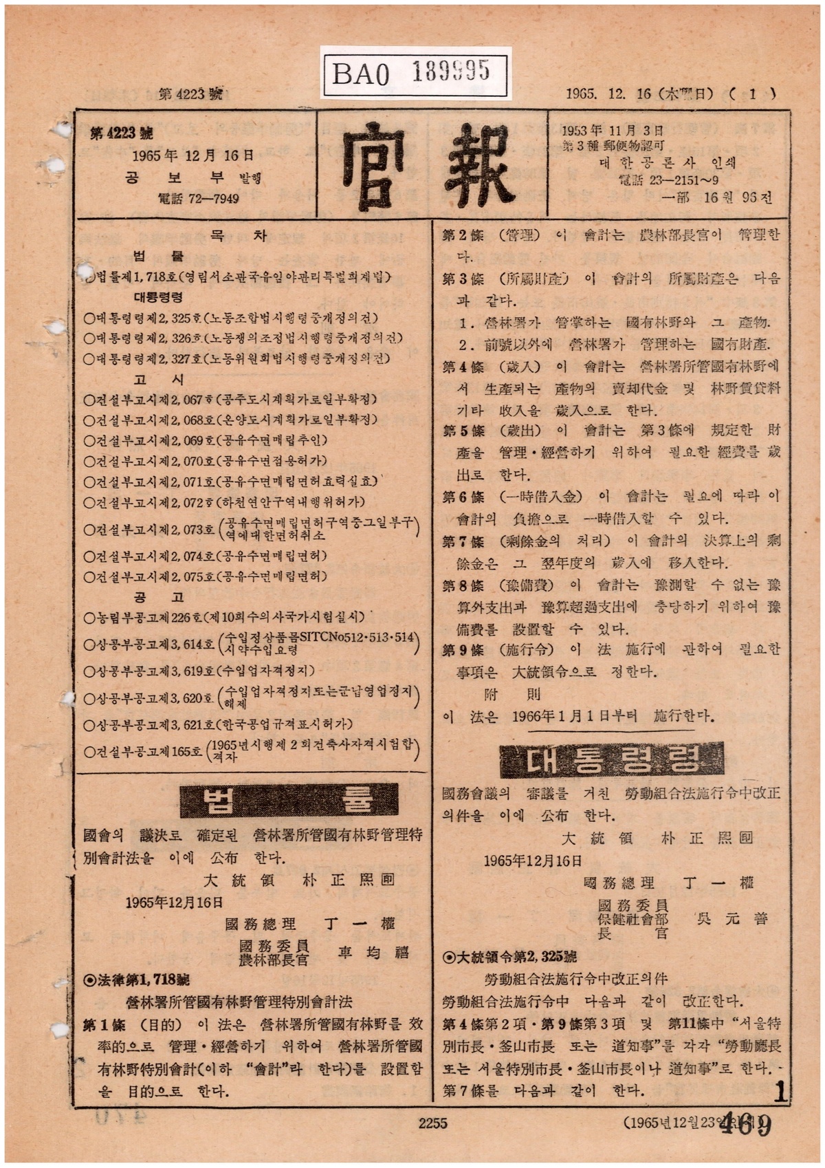 | 205 | 일반기록물 | 영림서소관국유임야관리특별회계법(법률제1718호) | 총무처 | 1965 |