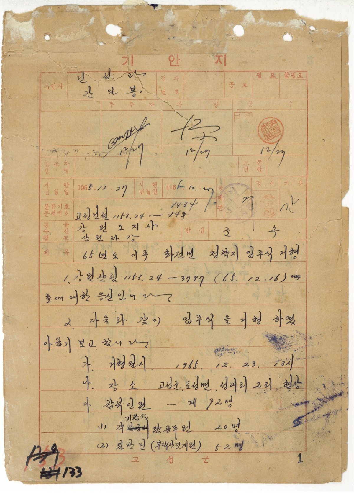 | 206 | 일반기록물 | 65년도이주화전민정착지입주식거행 | 강원도 | 1965 |