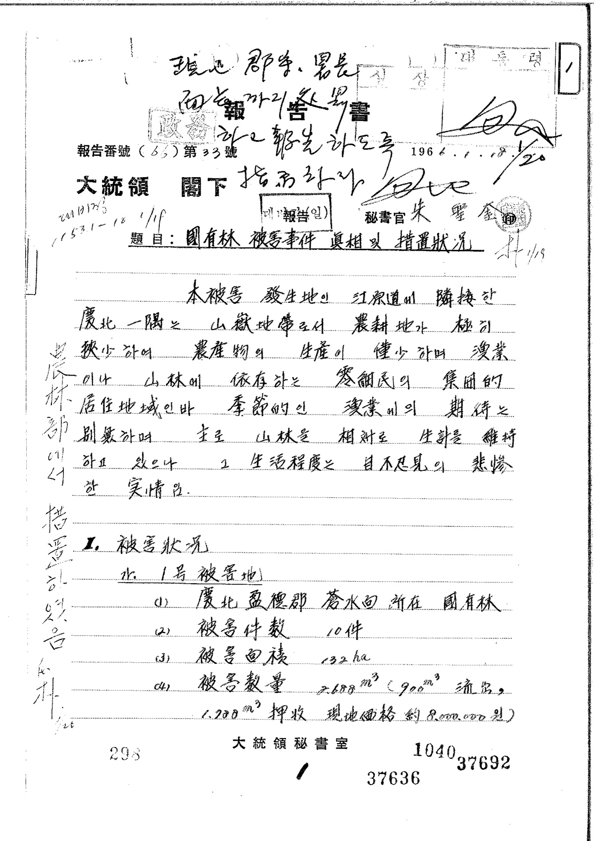 | 214 | 대통령기록물 | 국유림 피해사건 진상 및 조치상황 | 대통령비서실 | 1966 |