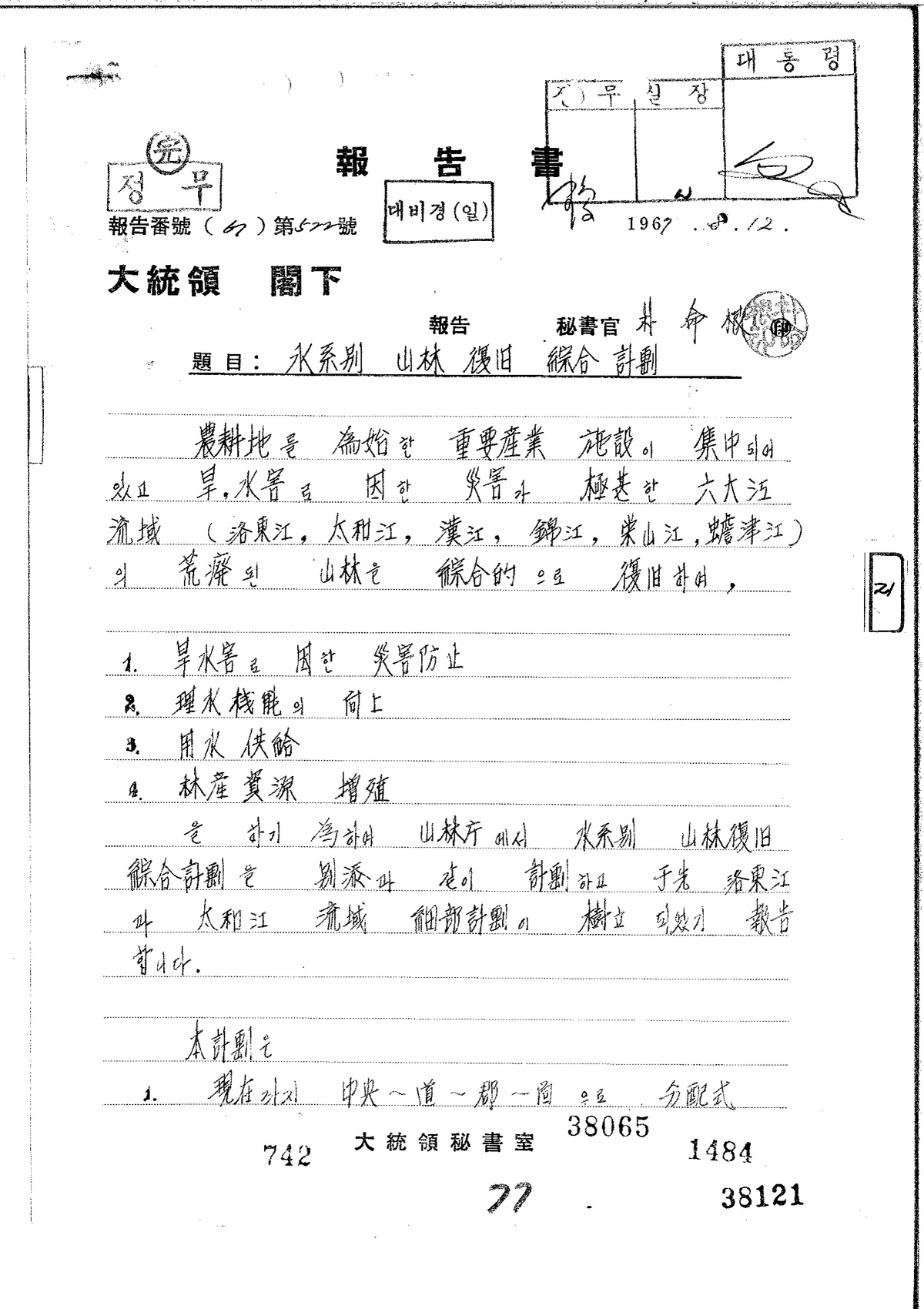 | 237 | 대통령기록물 | 수계별 산림복구 종합계획 | 대통령비서실 | 1967 |