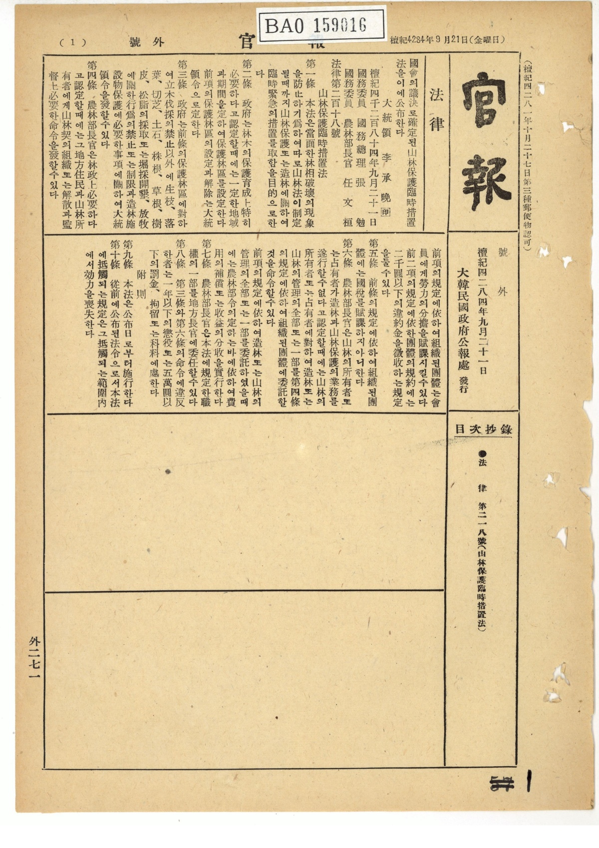 | 22 | 대통령기록물 | 산림보호임시조치법 | 법제처 | 1951 |