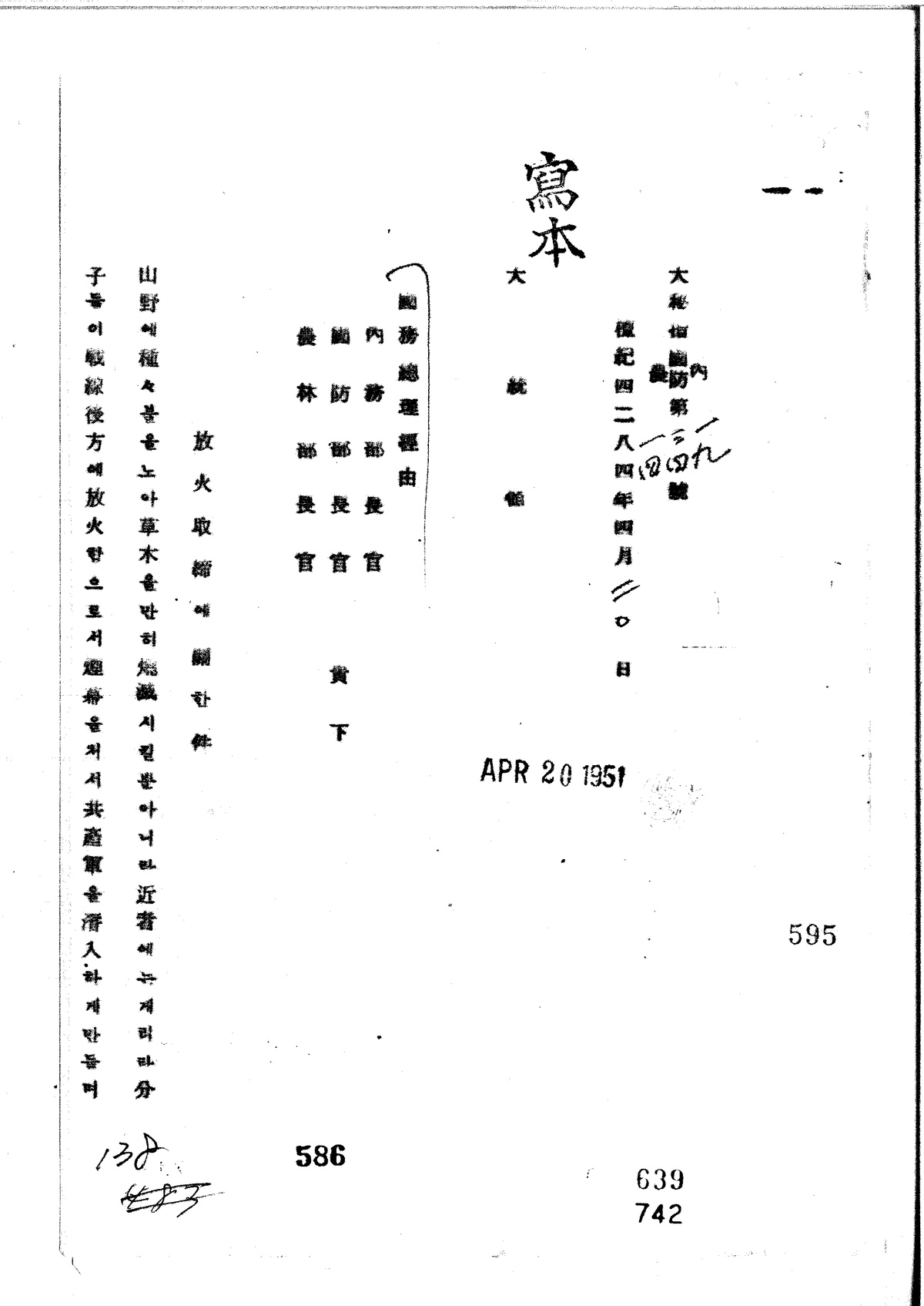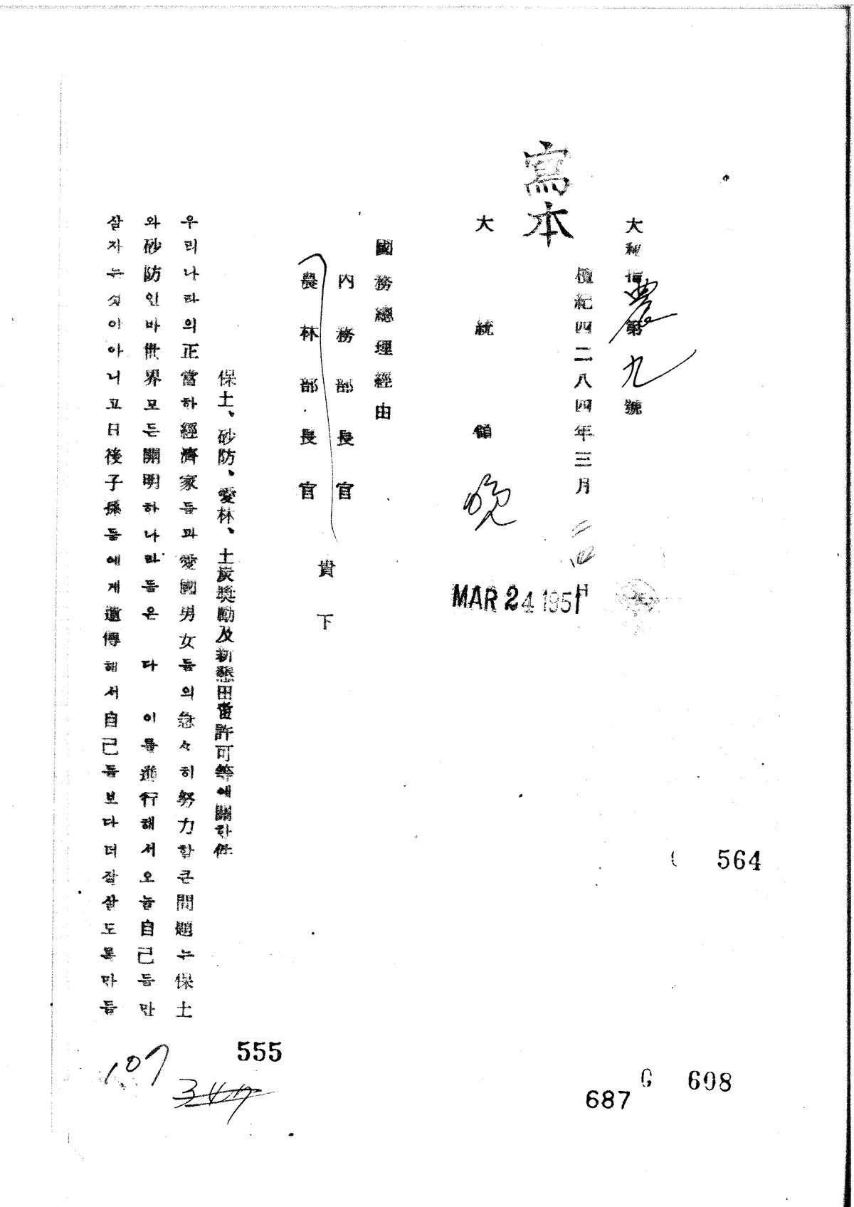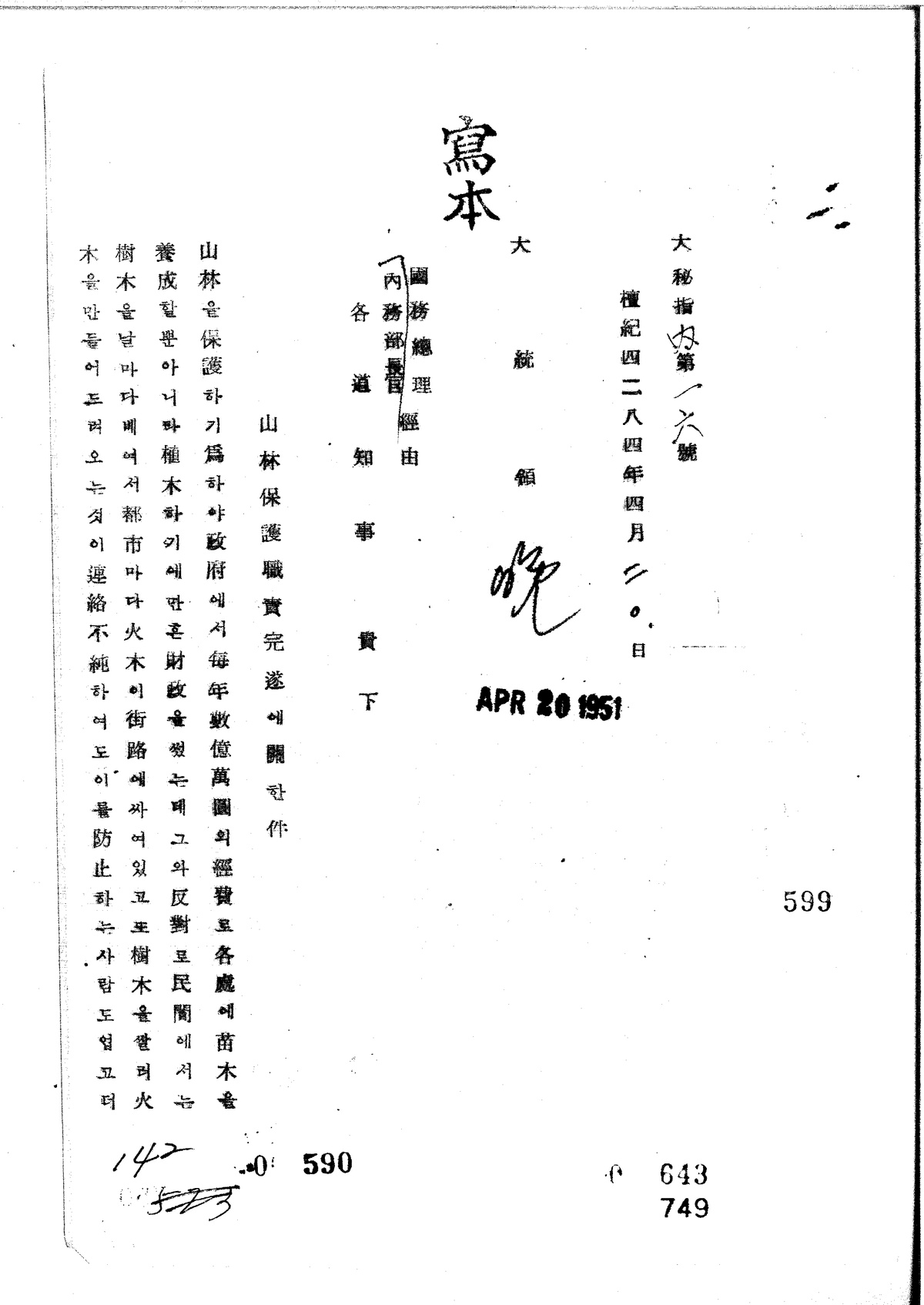 | 23 | 대통령기록물 | 산림 보호직책 완수에 관한 건 | 대통령비서실 | 1951 |
