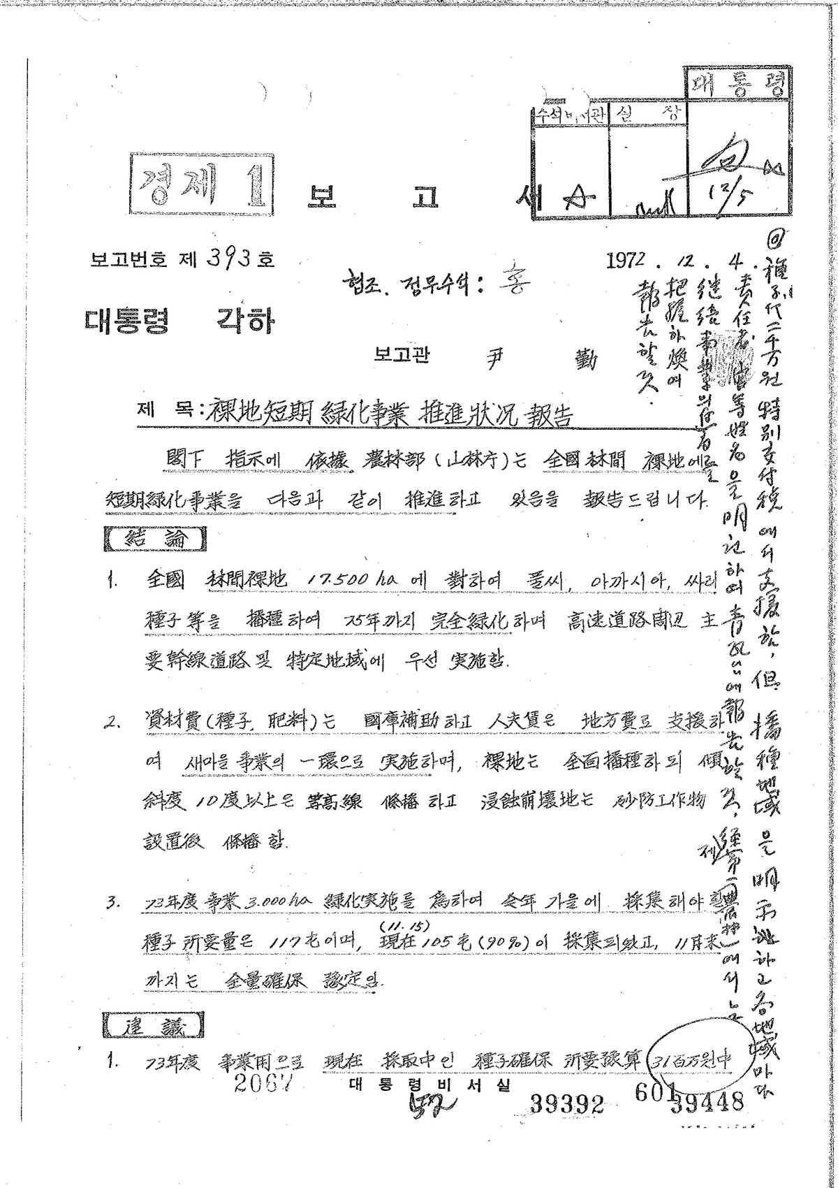 | 299 | 대통령기록물 | 나지단기 녹화 사업 추진상황 보고 | 대통령비서실 | 1972 |