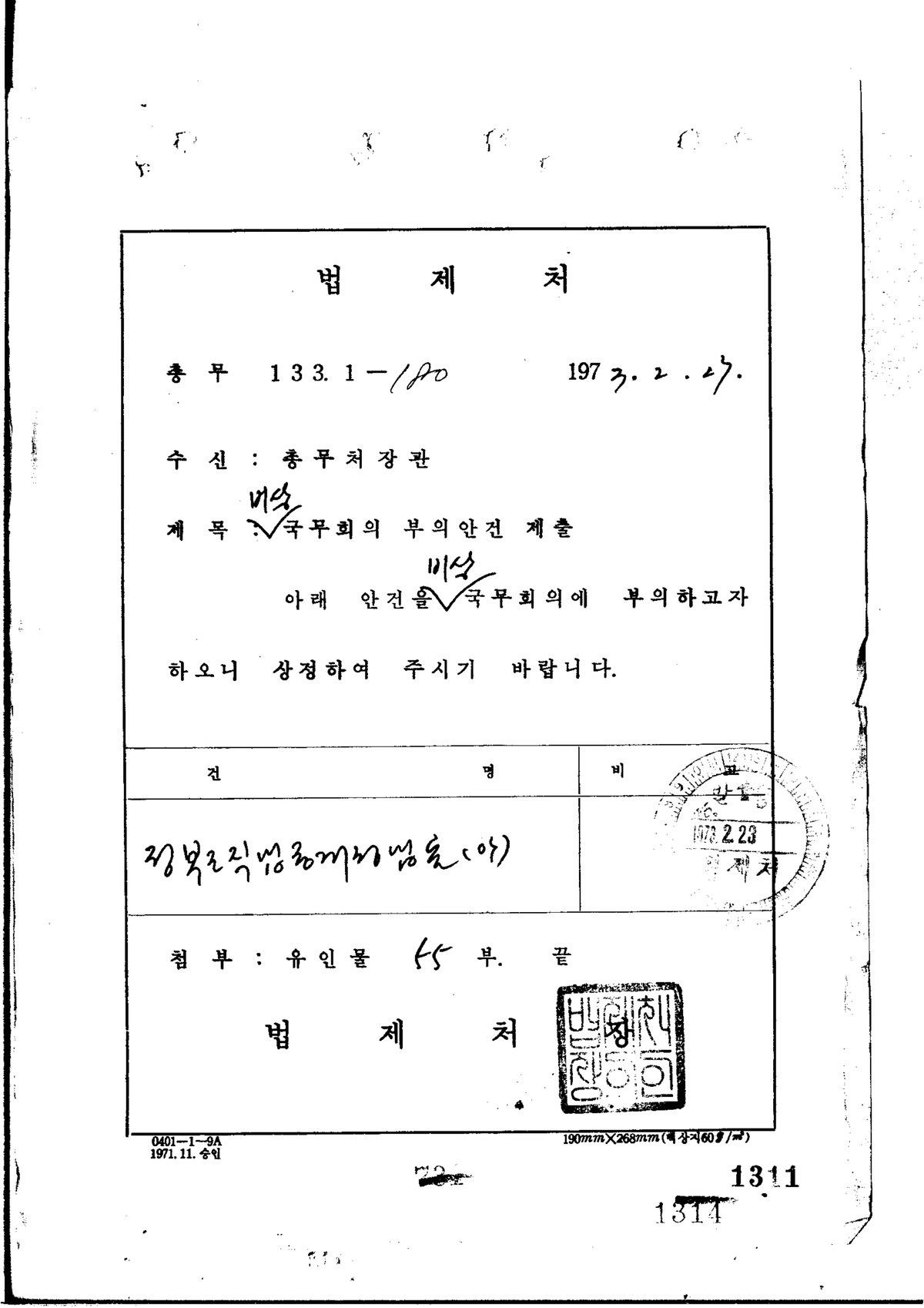 | 331 | 일반기록물 | 정부조직법 중 개정 법률(안) | 총무처 | 1973 |