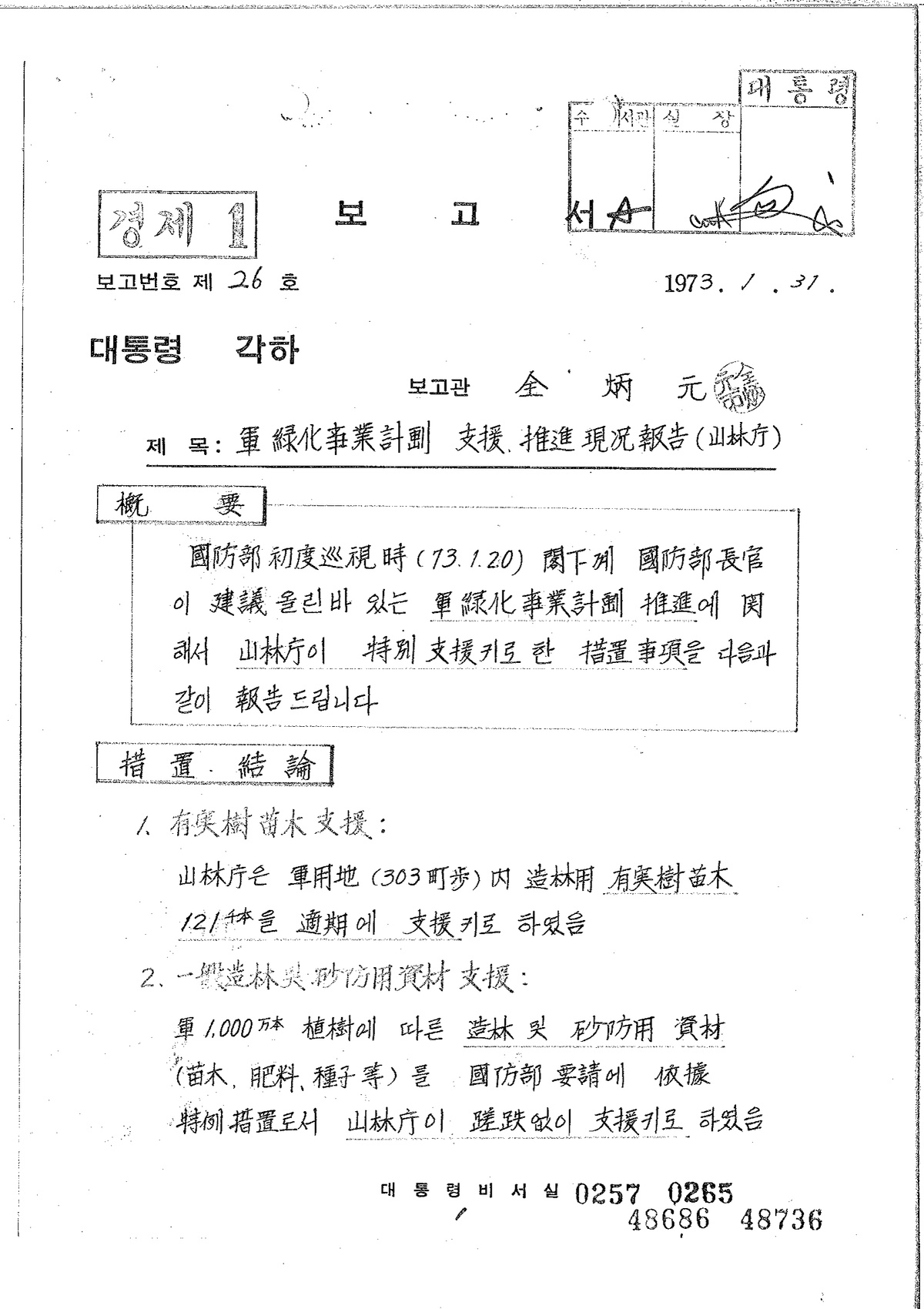 | 357 | 대통령기록물 | 군 녹화사업계획 지원추진 현황보고(산림청) | 대통령비서실 | 1973 |