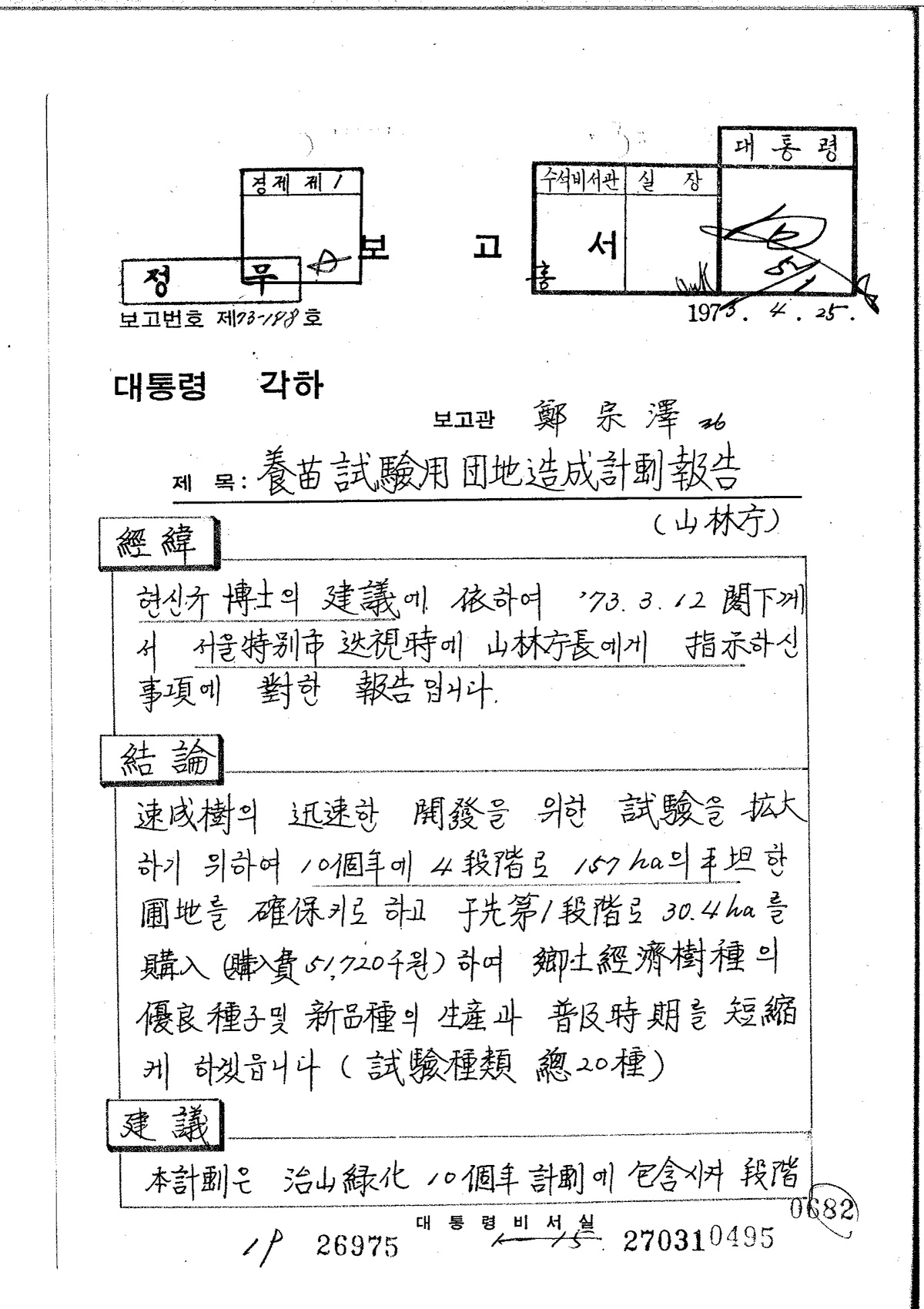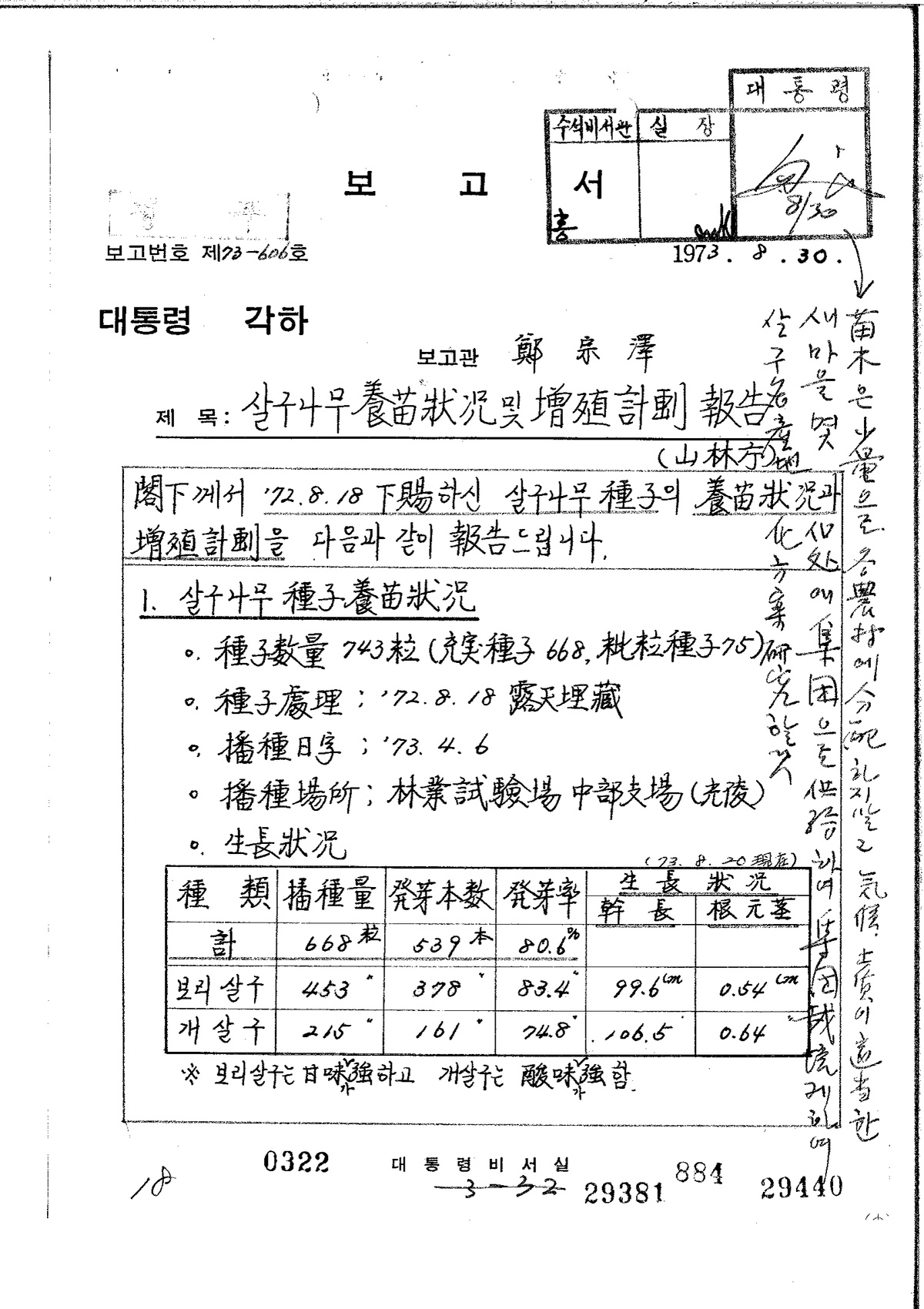 | 360 | 대통령기록물 | 살구나무 양묘상황 및 증식계획 보고 (산림청) | 대통령비서실 | 1973 |