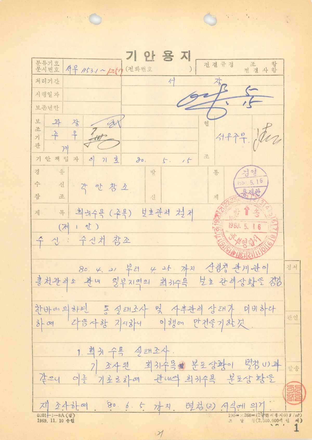 | 527 | 일반기록물 | 희귀수목(주목) 보호관리 철저 | 산림청 | 1980 |