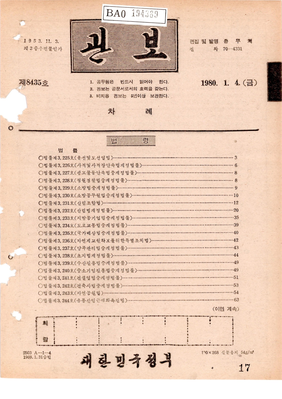 | 535 | 일반기록물 | 산림조합법(법률제3231호) | 총무처 | 1980 |