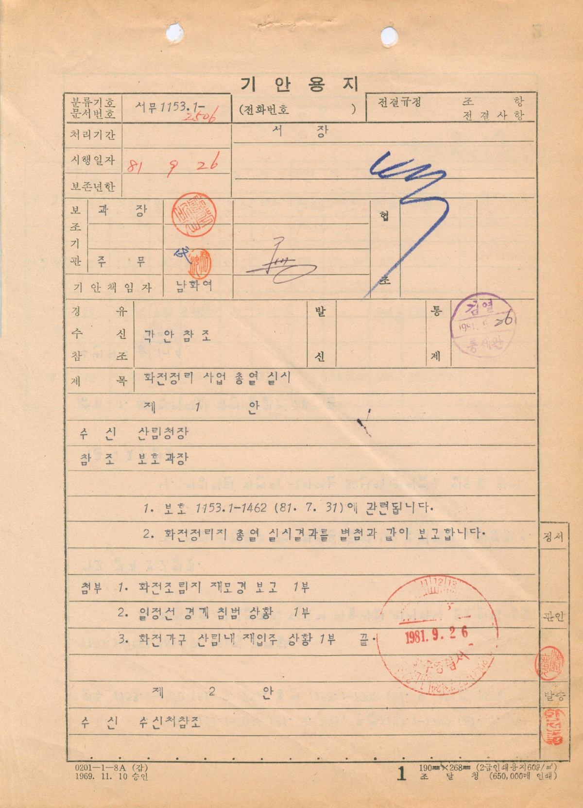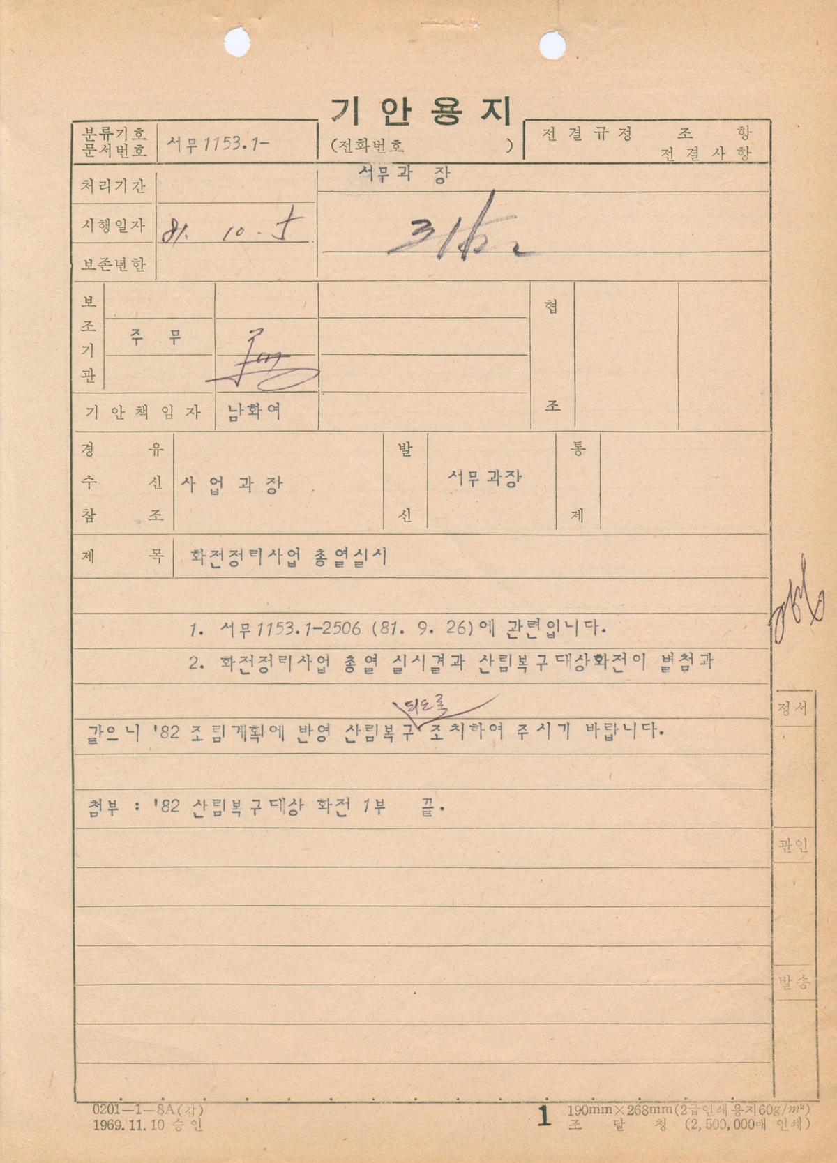 | 539 | 일반기록물 | 화전정리사업 총열 실시(조림계획 반영 지시) | 산림청 | 1981 |