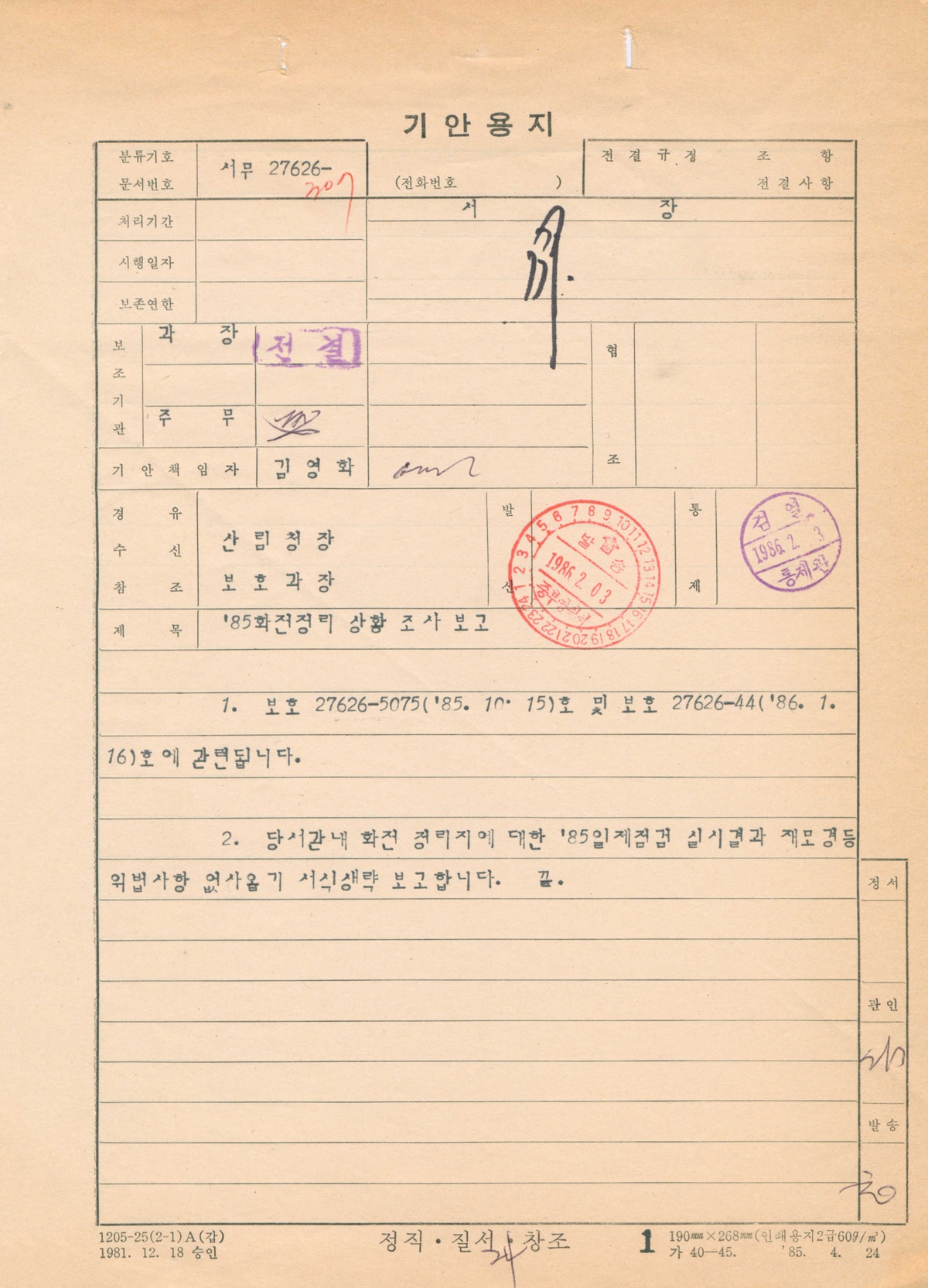 | 591 | 일반기록물 | 1985 화전정리 상황조사보고 | 산림청 | 1986 |