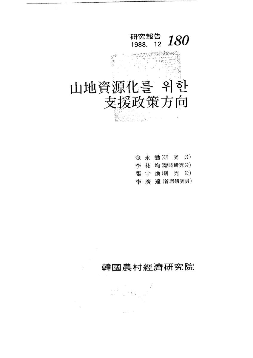 | 613 | 정부간행물 | 산지자원화를 위한 지원정책방향 | 한국농촌경제연구원 | 1988 |