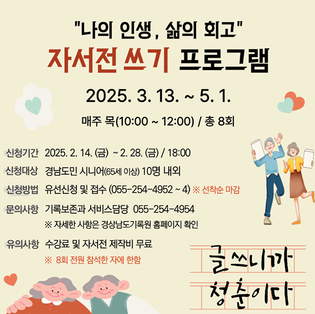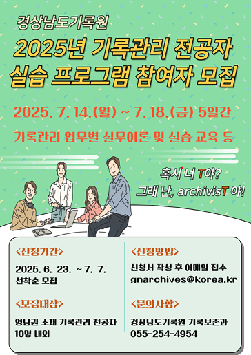 경상남도기록원은 2021년부터 도내 중·고등학생과 영남 권역의 기록 관리 전공자를 대상으로 기록원의 현장을 탐방하고, 기록연구사 직군에 대한 진로 탐색과 관련한 정보를 제공하는 맞춤형 기록 관리 교육 프로그램을 운영하고 있다.