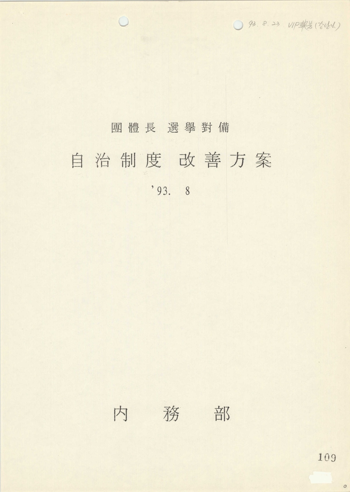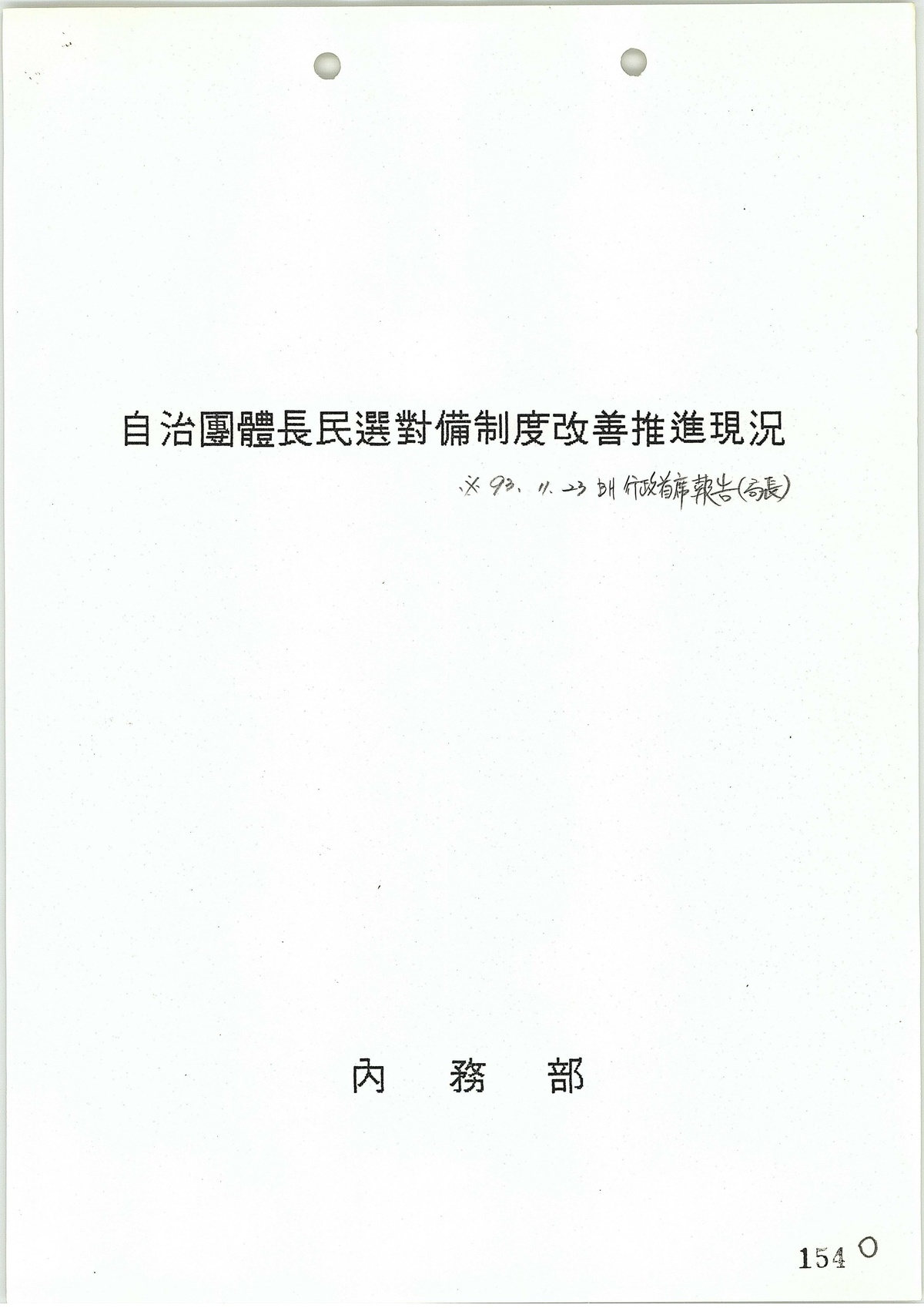 | 152 | 일반기록물 | 단체장 선거 대비 자치제도 개선 방안 | 행정자치부 | 1993 |
