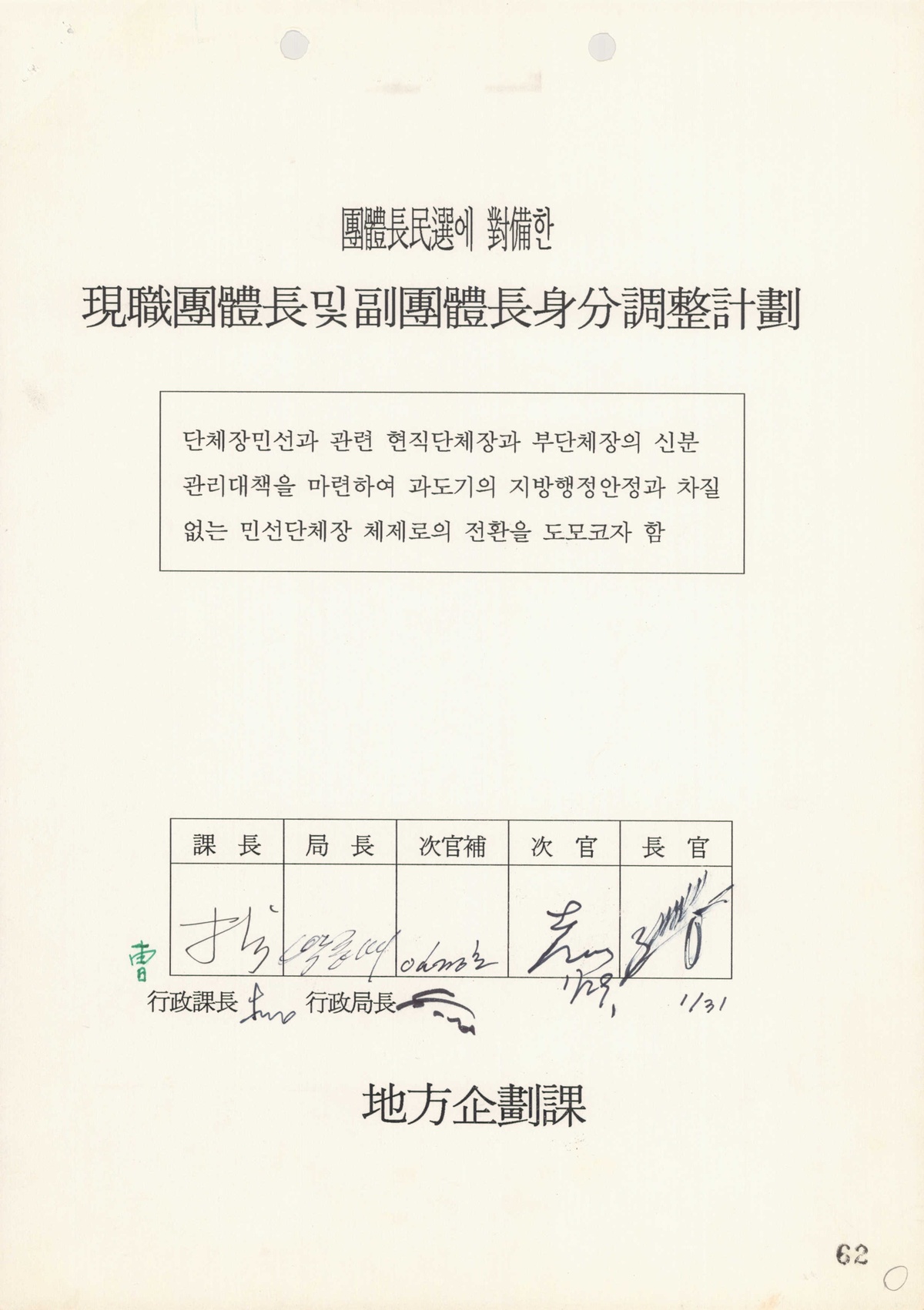 | 155 | 일반기록물 | 단체장 민선에 대비한 현직 단체장 및 부단체장 신분 조정 계획 | 행정자치부 | 1994 |