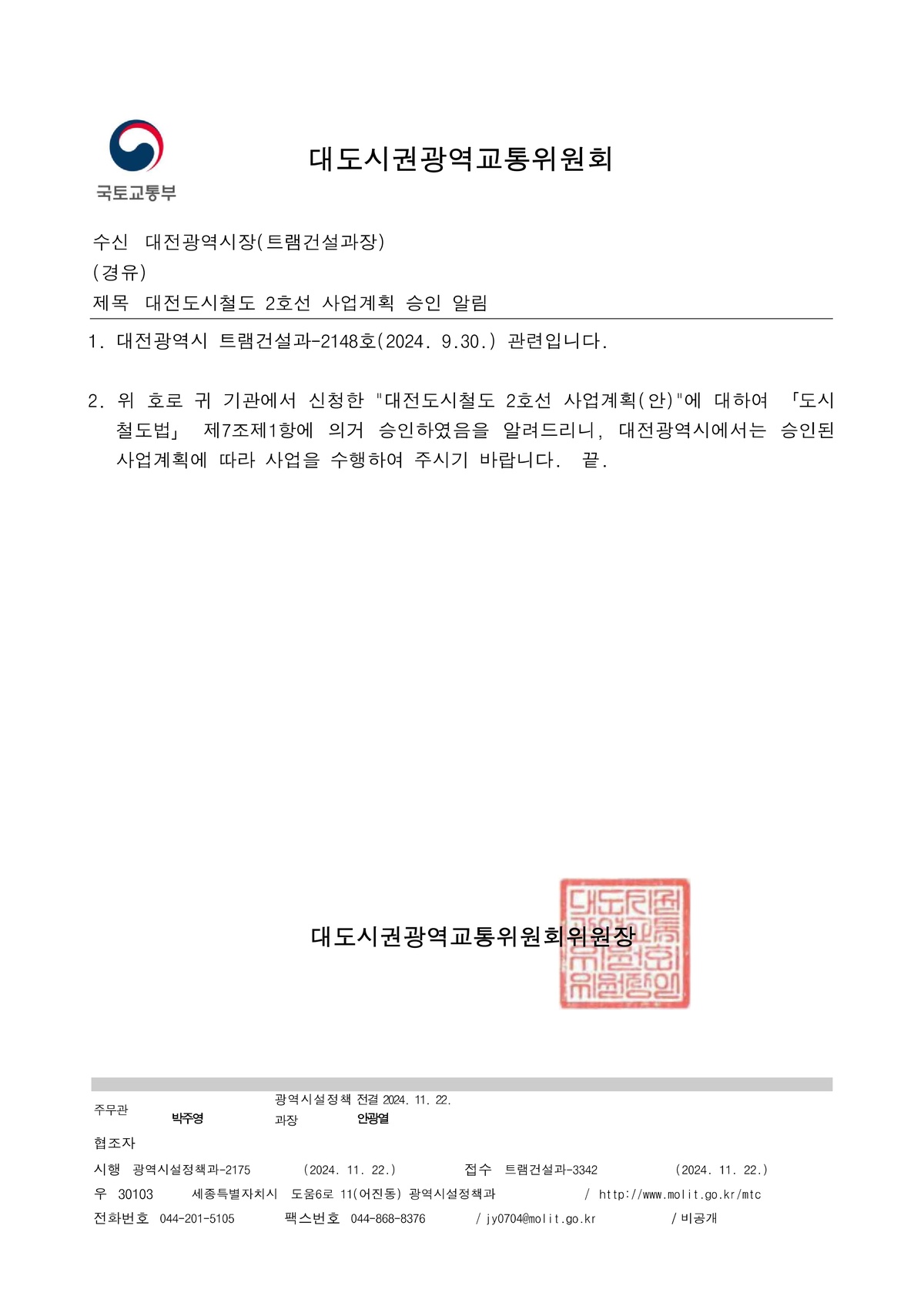 | 47 | 일반기록물 | 대전도시철도 2호선 사업계획 승인 | 국토교통부 대도시광역교통위원회 | 2024 |