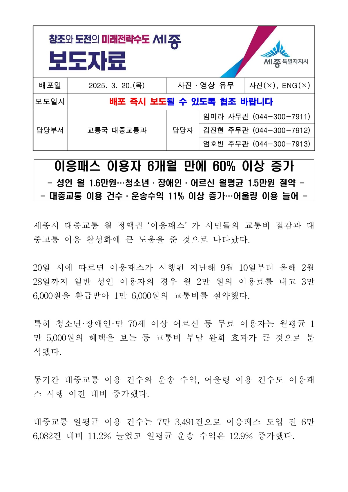 | 48 | 일반기록물 | 이응패스 성과 보도자료 | 세종특별자치시 대중교통과 | 2025 |
