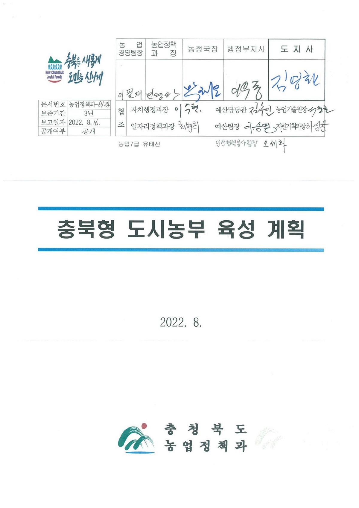 | 52 | 일반기록물 | 충북형 도시농부 육성 계획 | 충청북도 농업정책과 | 2022 |