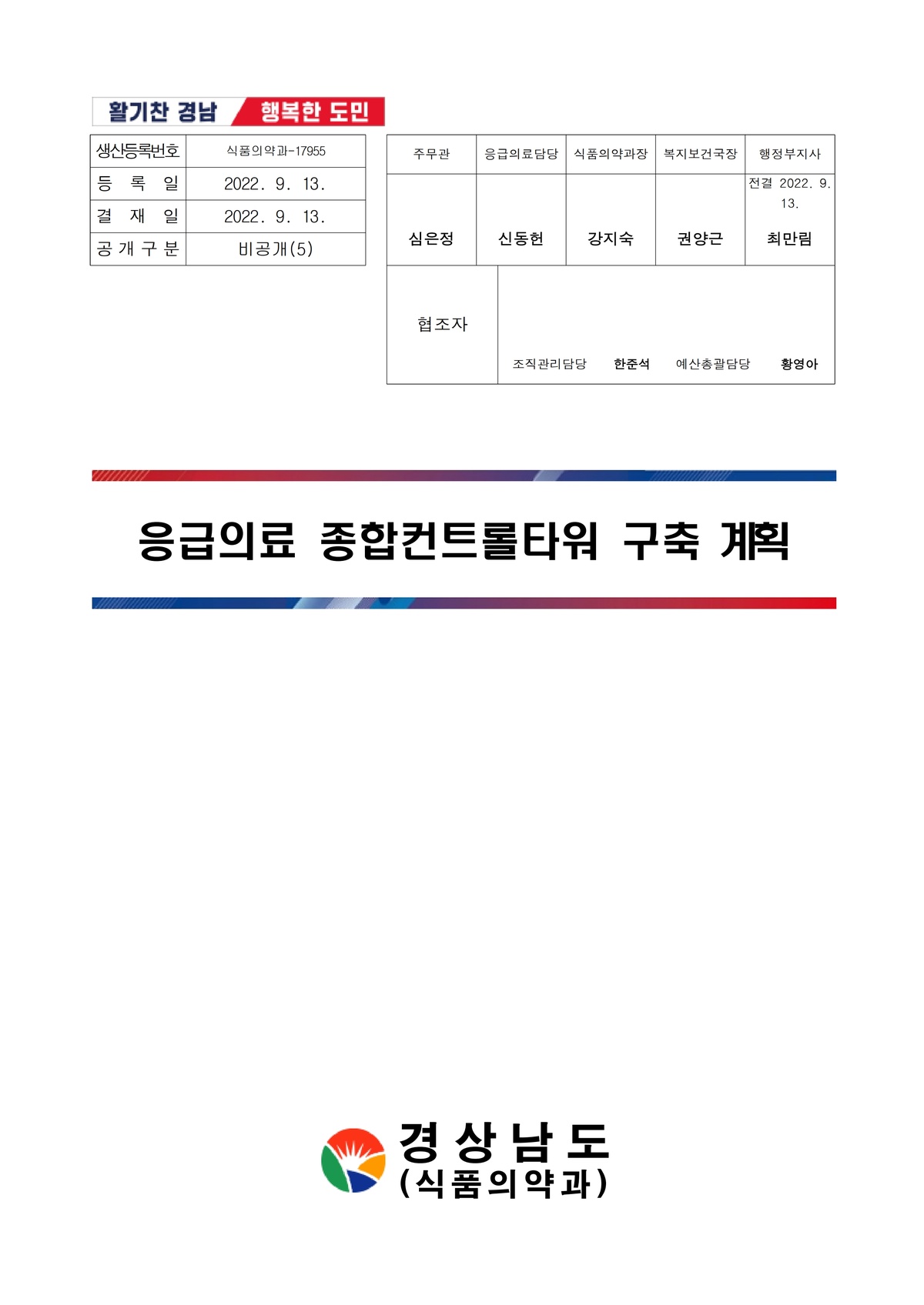 | 59 | 일반기록물 | 경상남도 응급의료 종합컨트롤타워 구축 계획 | 경상남도 식품의약과 | 2022 |
