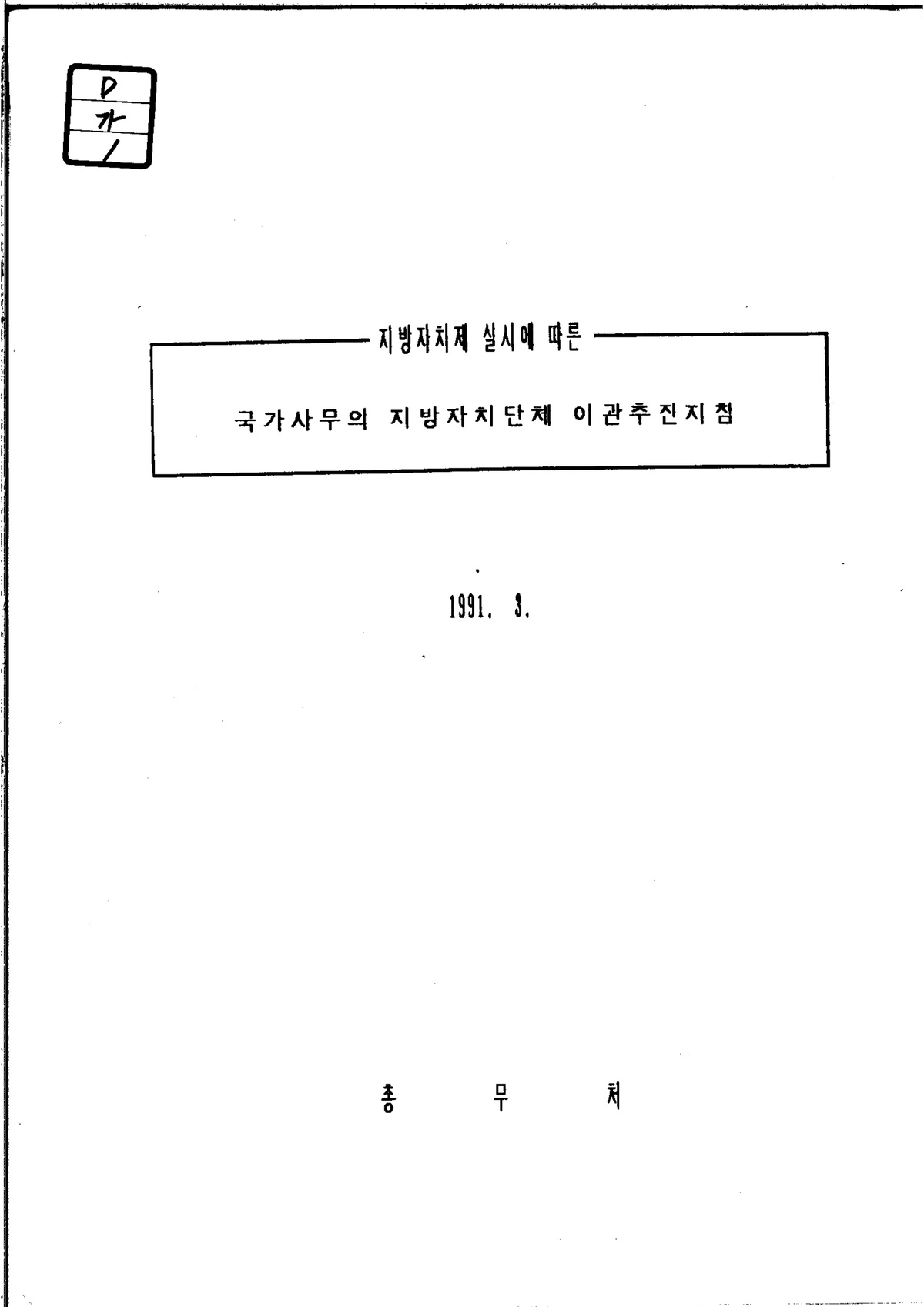 | 249 | 간행물 | 지방자치제 실시에 따른 국가사무의 지방자치단체 이관 추진 지침 | 총무처 | 1991 |