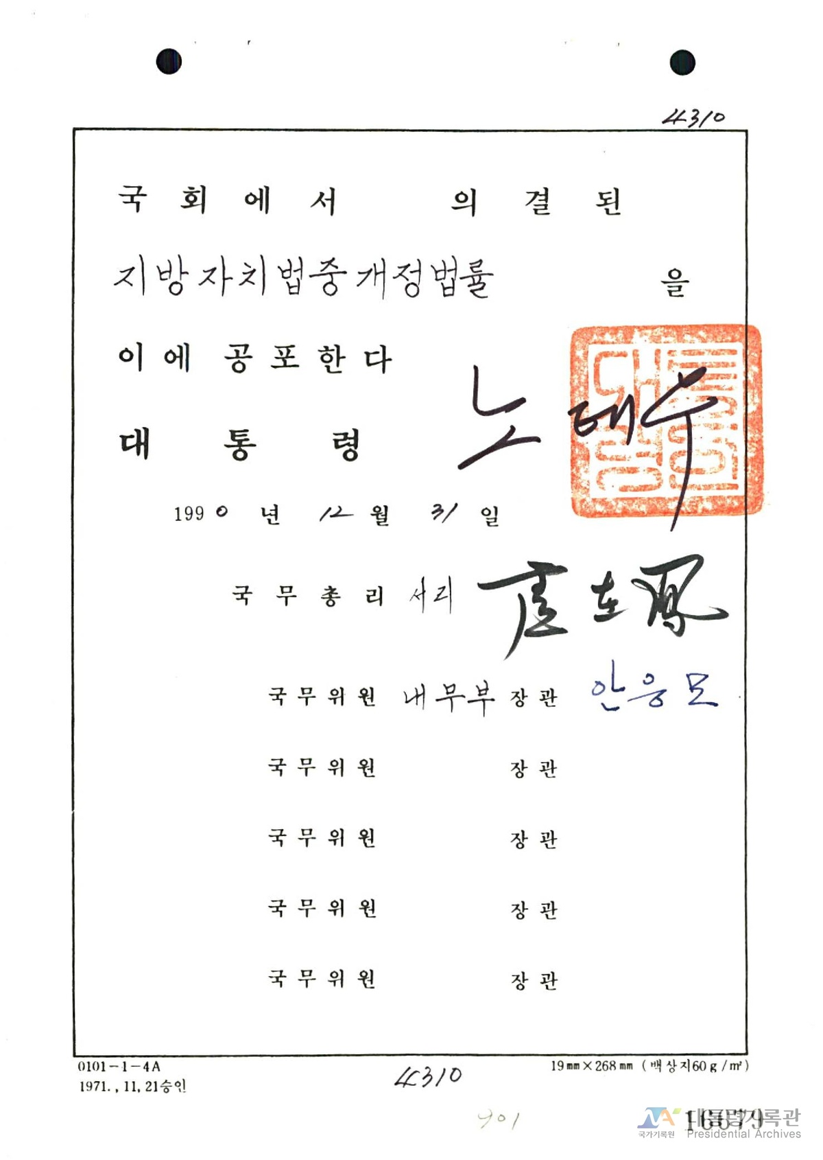 | 31 | 대통령기록물 | 지방자치법 개정 공포 건 | 법제처 | 1990 |