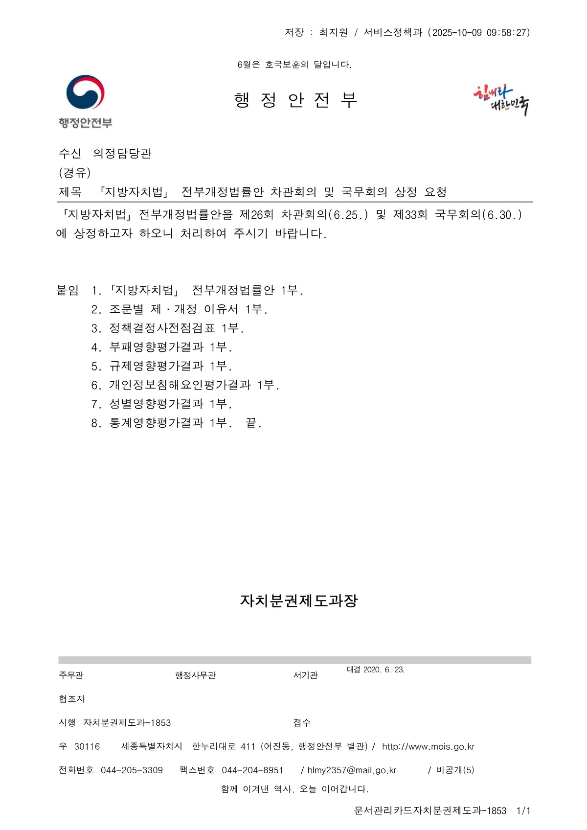 | 36 | 일반기록물 | 지방자치법 전부개정법률안 차관회의 및 국무회의 상정 | 행정안전부 | 2020 |