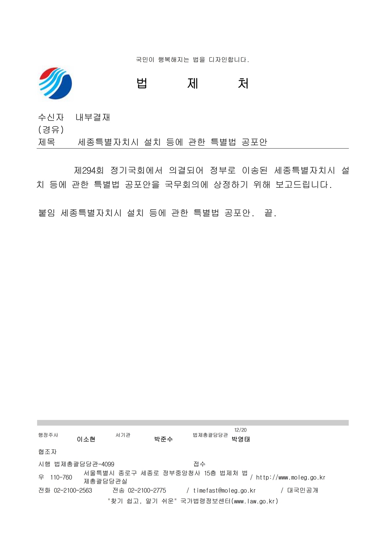 | 39 | 일반기록물 | 세종특별자치시 설치 등에 대한 특별법 국무회의 상정 | 법제처 | 2010 |