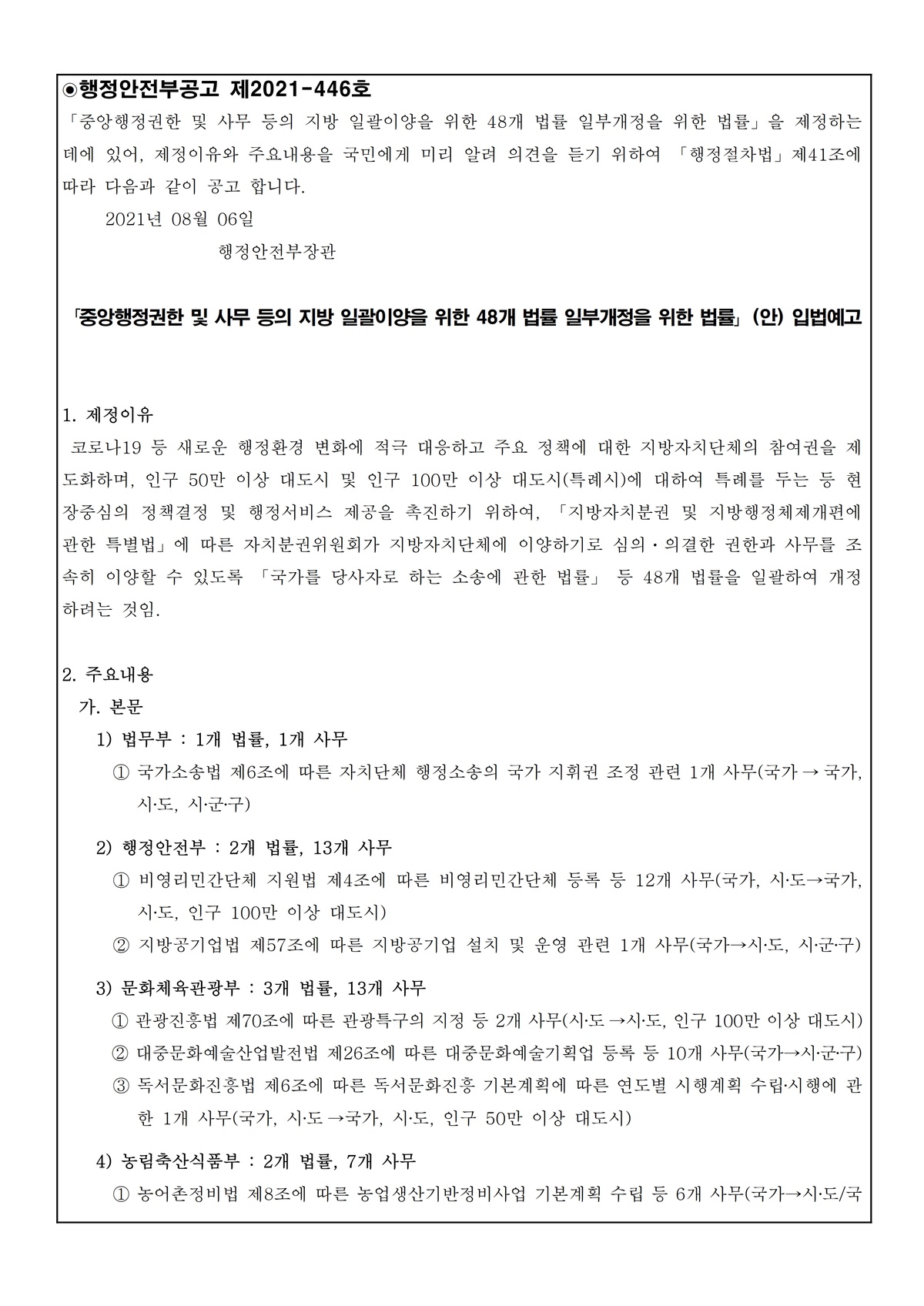 | 72 | 일반기록물 | 「중앙행정권한 및 사무 등의 지방 일괄이양을 위한 48개 법률 일부개정을 위한 법률」(안) 입법예고 | 행정안전부 | 2021 |