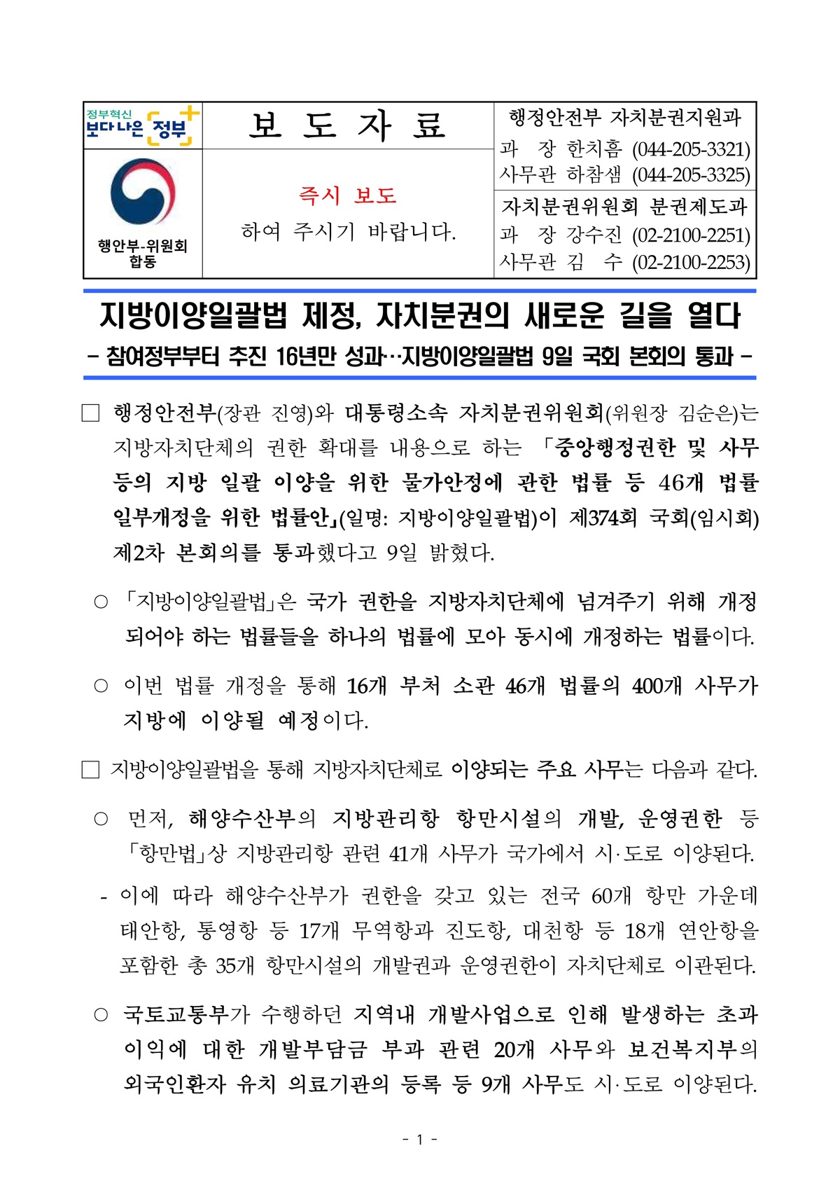 | 73 | 일반기록물 | 지방일괄이양법 제정 보도자료 | 행정안전부 자치분권지원과 | 2020 |