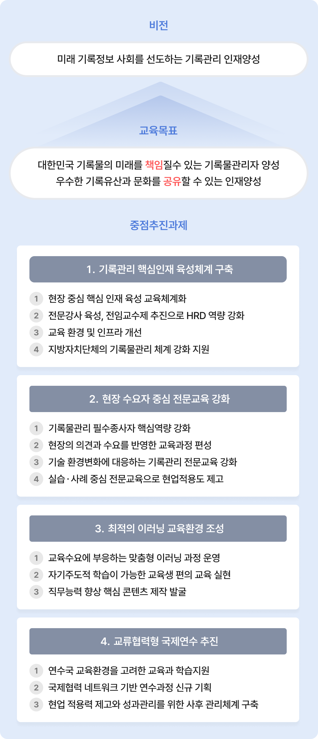 - 제6기 국가기록관리위원회 산하 기록정책전문위원회 위원('23년~)으로 활동하면서 국내 최초로 '기록매체박물관' 개관·운영 등 기록문화 확산에 기여했다. 또한, '국가문헌보존관' 건립 및 '자료보존연구센터' 조직을 신설하여 연간 20만 여 권 보존처리, 해외 각국 교육지원 및 국내 훼손기록물 위탁처리 등 기록보존 업무에 기여했다.